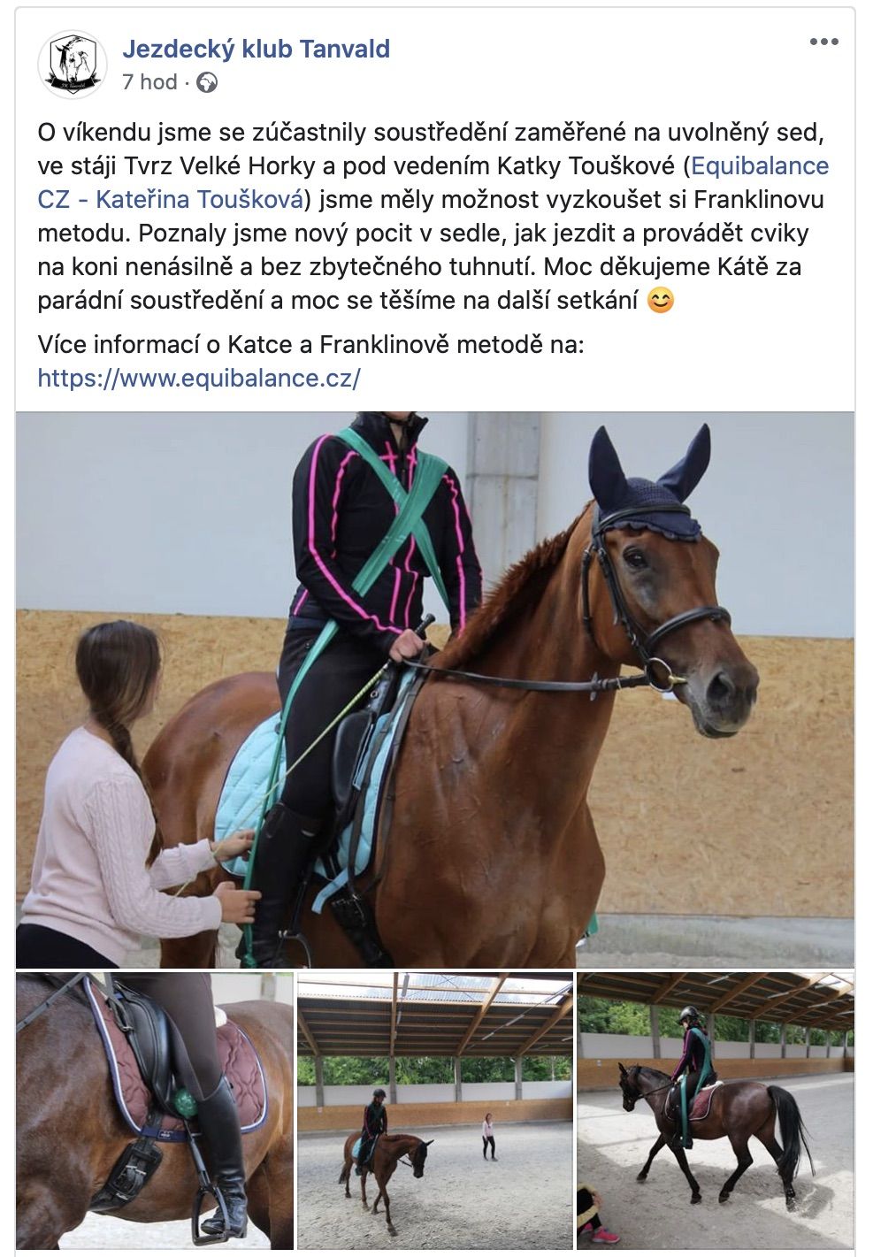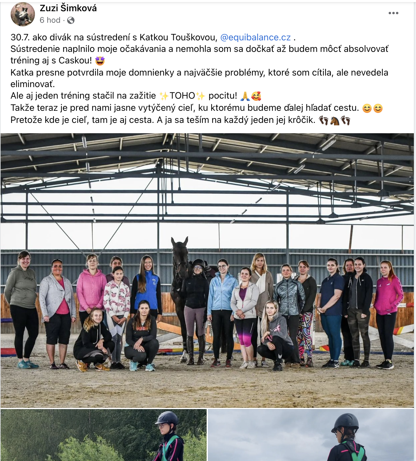 Dlouhodobě jsem bojovala u svých koní s křivostí a u sebe samé s velkou bolestí zad. Vyzkoušela jsem celou řadu "zaručených rad" od odborníků jak správně sedět a jezdit, jejichž aplikace v praxi nepomohla ani mně a ani mým koním. Na doporučení jsem si vyzkoušela trénink s Káťou. Velmi jednoduše a lidsky mi sdělila, co je příčinou mých dlouhodobých problémů a vysvětlila mi, jakým způsobem jezdit, aniž bych si dál ničila své tělo a mohla v aktivním ježdění i nadále pokračovat. Řešení bylo ušité mně přímo na míru přesně podle toho, čeho bylo moje tělo aktuálně fyzicky schopné. Žádná snaha o ideální učebnicový sed, jako tomu bylo u jiných trenérů, která vedla pouze k tuhnutí, nikoli k uvolněnému sedu nezbytnému pro uvolněného koně. Znamenalo to pro mne sice vrátit se po mnoha letech ježdění úplně na začátek, efekt byl však okamžitý - jak pro mne, tak pro mé koně. A to je pro mne jasný důkaz toho, že jdeme správnou cestou.