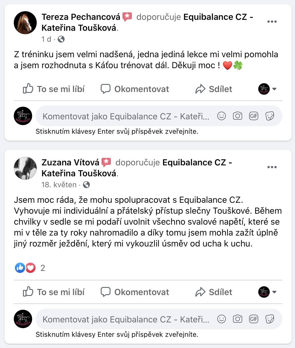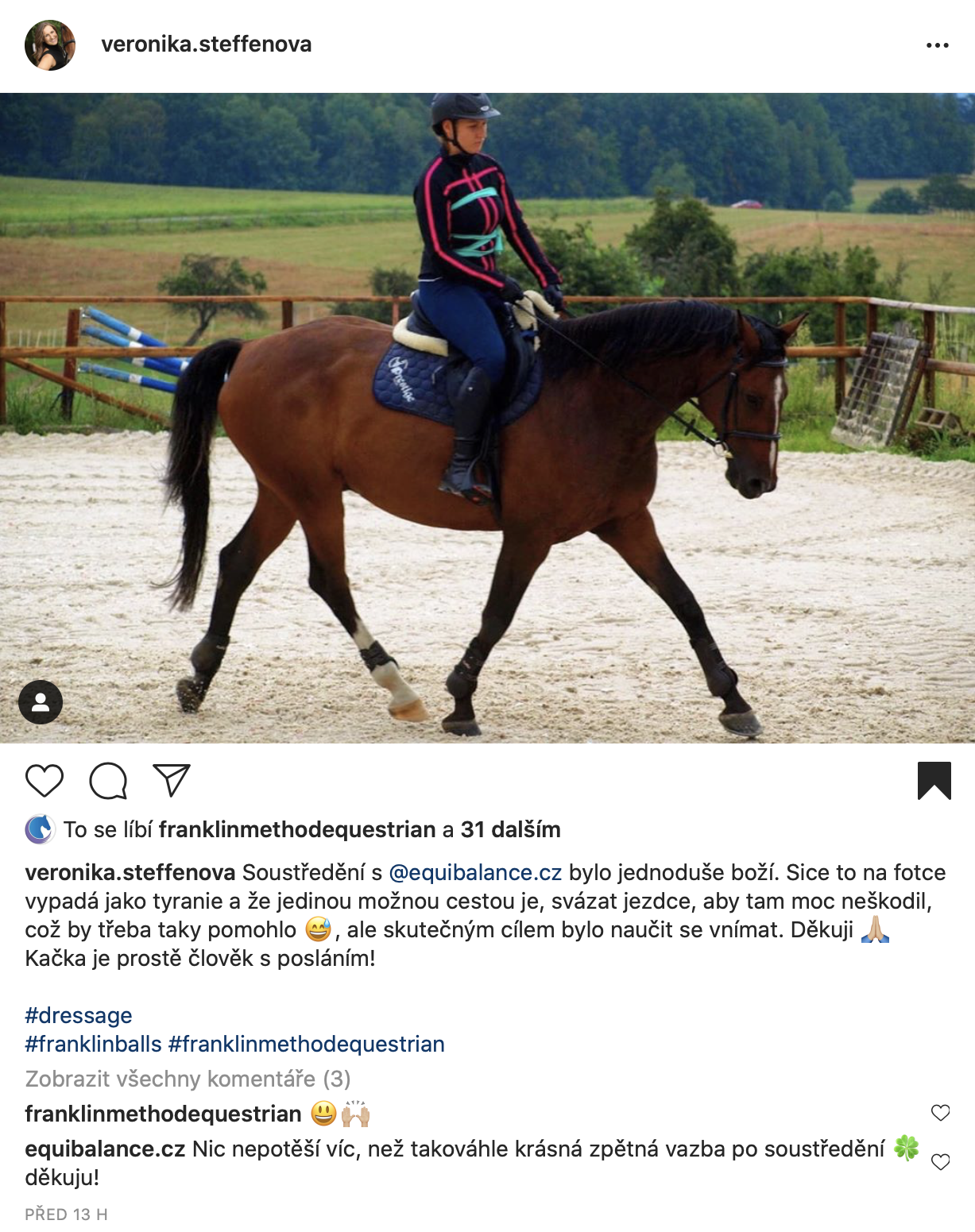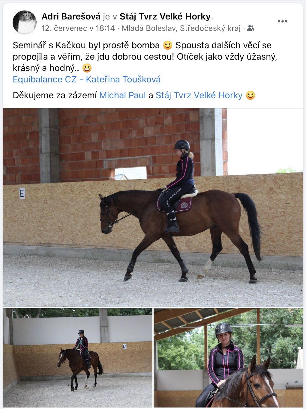 Dlouhodobě jsem bojovala u svých koní s křivostí a u sebe samé s velkou bolestí zad. Vyzkoušela jsem celou řadu "zaručených rad" od odborníků jak správně sedět a jezdit, jejichž aplikace v praxi nepomohla ani mně a ani mým koním. Na doporučení jsem si vyzkoušela trénink s Káťou. Velmi jednoduše a lidsky mi sdělila, co je příčinou mých dlouhodobých problémů a vysvětlila mi, jakým způsobem jezdit, aniž bych si dál ničila své tělo a mohla v aktivním ježdění i nadále pokračovat. Řešení bylo ušité mně přímo na míru přesně podle toho, čeho bylo moje tělo aktuálně fyzicky schopné. Žádná snaha o ideální učebnicový sed, jako tomu bylo u jiných trenérů, která vedla pouze k tuhnutí, nikoli k uvolněnému sedu nezbytnému pro uvolněného koně. Znamenalo to pro mne sice vrátit se po mnoha letech ježdění úplně na začátek, efekt byl však okamžitý - jak pro mne, tak pro mé koně. A to je pro mne jasný důkaz toho, že jdeme správnou cestou.
