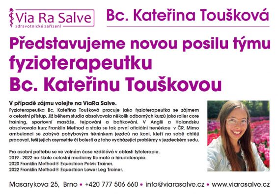 ViaRa Salve je zdravotnické zařízení zaměřující se na prevenci zdravotních problémů. Nabízí komplexní péči od základního stanovení zdravotního stavu až po speciální terapie a snaží se o celostní přístup. Já mám to štěstí že jsem se mohla stát součástí jejich týmu a tak zde budu od prosince 2022 pracovat jako fyzioterapeut.